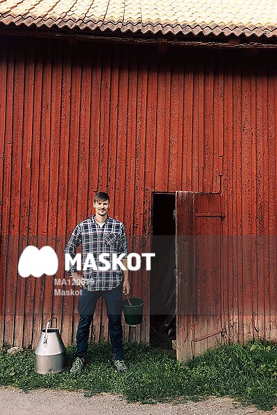 Porträtt av manlig bonde som står utanför lada