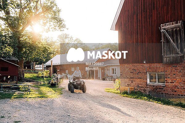 Kvinnlig bonde åker fyrhjuling utanför lada