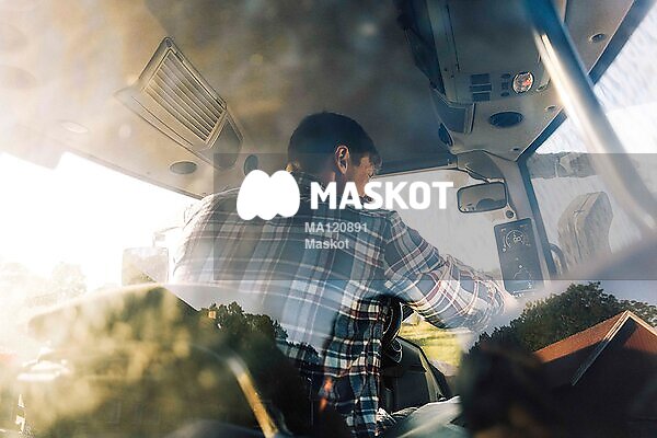 Manlig bonde kör traktor