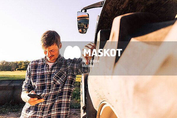 Manlig bonde kollar i mobil och står lutad mot traktor