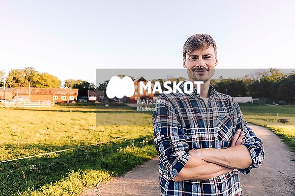 Porträtt av manlig bonde som står utanför bondgård