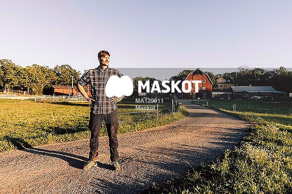 Manlig bonde står på grusväg vid bondgård