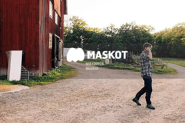 Manlig bonde pratar i mobil utanför lada