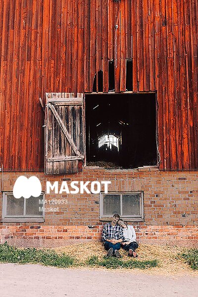 Manlig och kvinnlig bonde som siter utanför lada