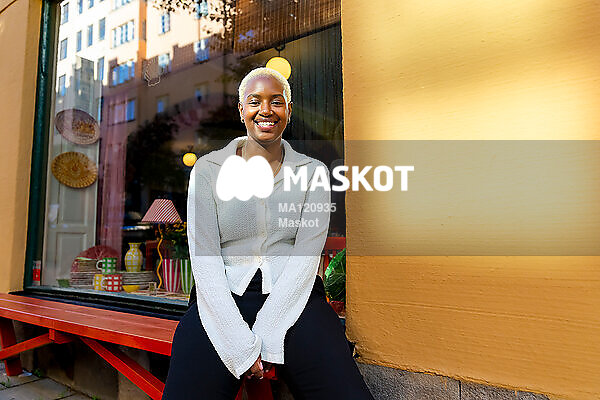Porträtt av leende kvinnlig ägare som sitter utanför affär