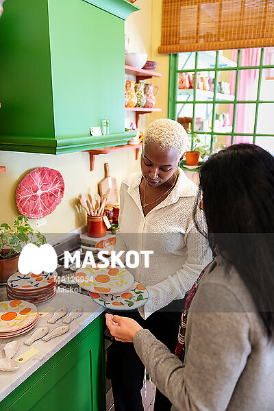 Kvinnlig ägare hjälper kund i inredningsaffär