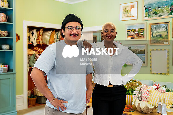 Porträtt av manlig och kvinnlig ägare som står i inredningsaffär