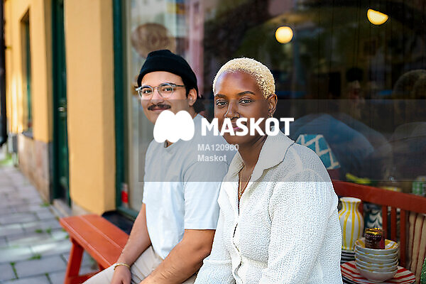 Porträtt av man och kvinna som sitter utanför inredningsaffär