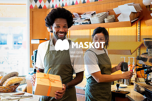 Porträtt av manlig barista som håller i paket