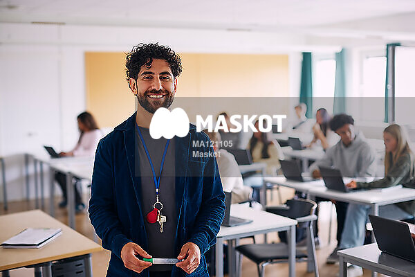 Porträtt av glad manlig gymnasielärare som håller i penna