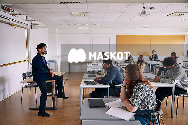 Manlig gymnasielärare sitter på bord i klassrum