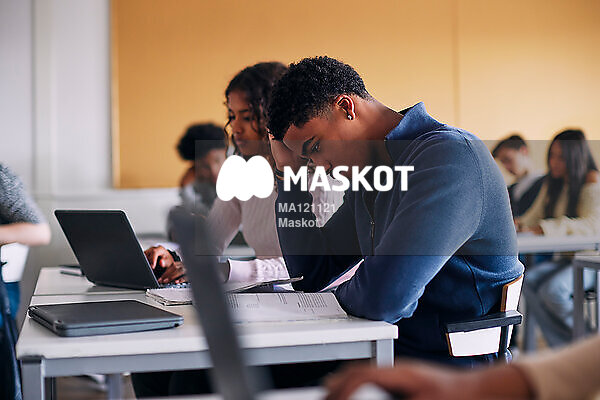 Fundersam gymnasieelev jobbar under lektion