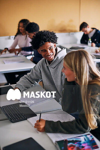 Leende tonårspojke jobbar med klasskamrat under lektion