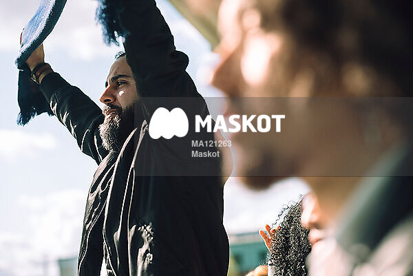 Man håller upp halsduk på läktare under match