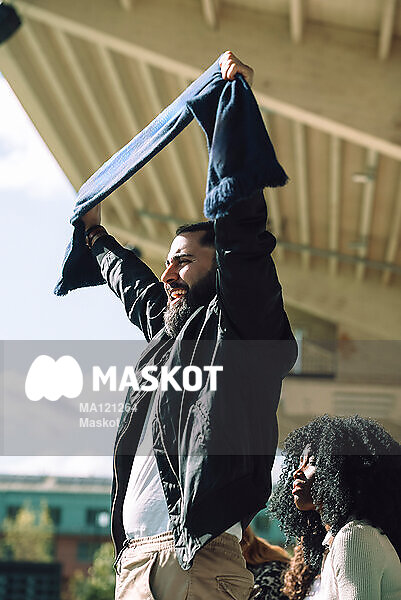 Glad man håller upp halsduk på läktare under match
