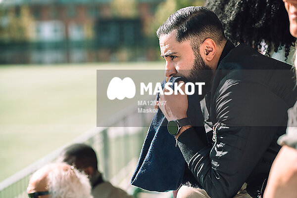 Engagerad man kramar halsduk på läktare under match