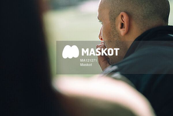Oroad man sitter på läktare och kollar på fotbollsmatch