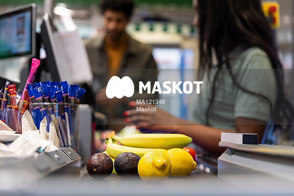 Kvinnlig kassörska scannar varor