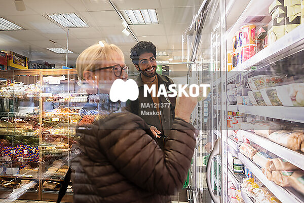 Leende ung man och äldre kvinna handlar på livsmedelsbutik