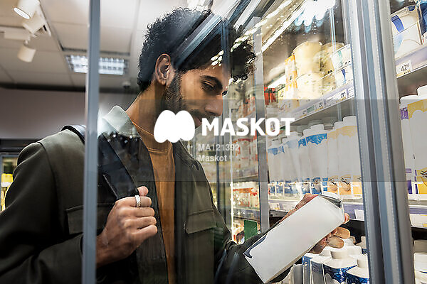 Ung man handlar mjölk i livsmedelsbutik
