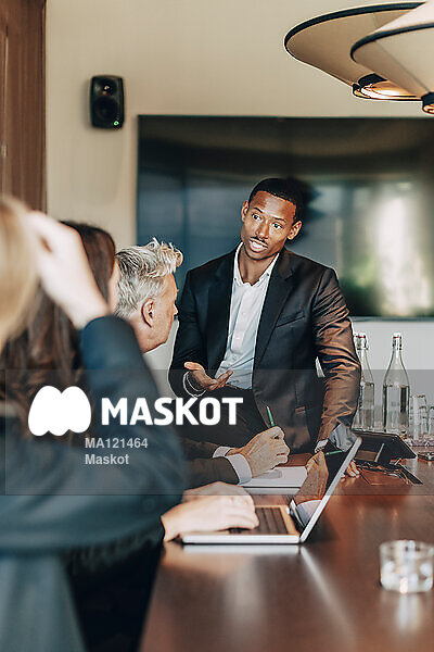 Ung manlig advokat diskuterar med kollegor