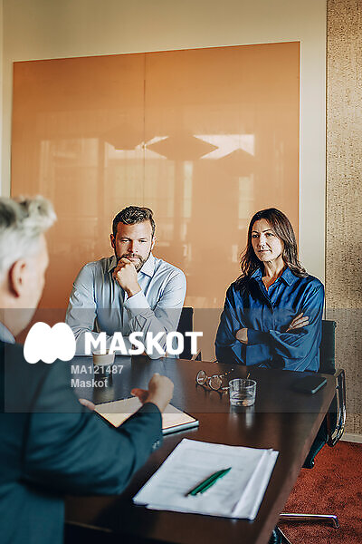 Manlig och kvinnlig advokat pratar med kollega under möte