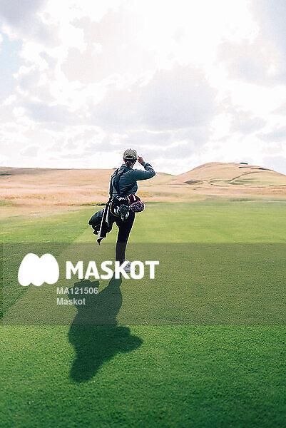 Kvinna står på tee med golfbag