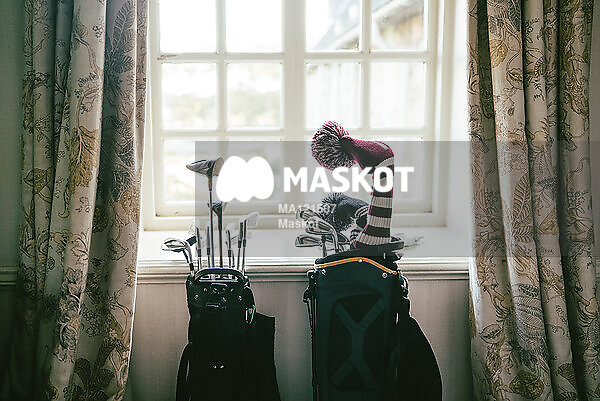 Golfklubbor står i bagar framför fönster