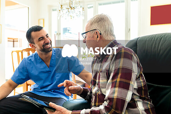 Manlig vårdgivare sitter med äldre man som håller i surfplatta