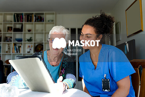 Äldre kvinna använder surfplatta bredvid vårdgivare