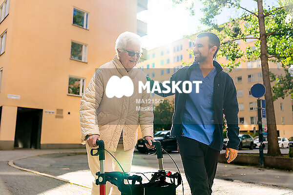 Glad manlig vårdgivare går med äldre kvinna