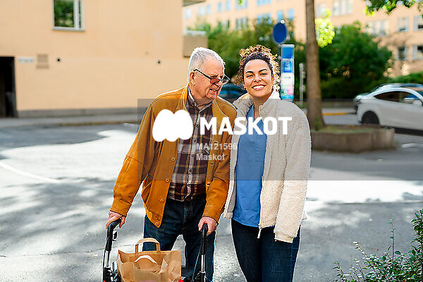 Porträtt av vårdgivare ståendes med äldre man