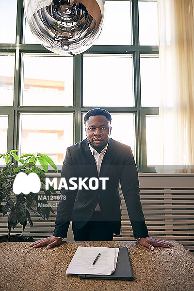 Porträtt av affärsman som står vid bord