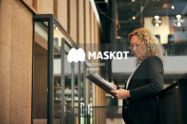 Affärskvinna håller i papper vid räcke