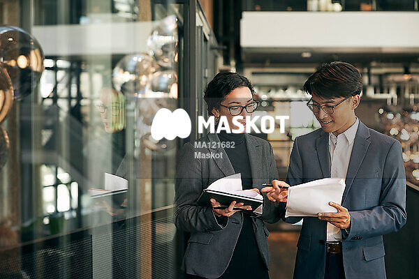 Ung affärsman och affärskvinna pratar