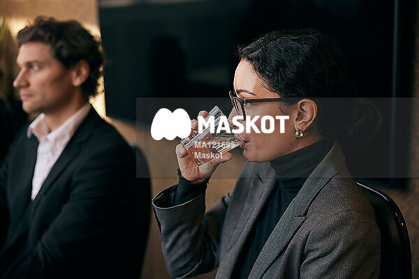 Kvinnlig entreprenör dricker vatten under möte