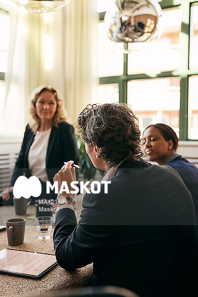Affärsman sitter i möte med kollegor