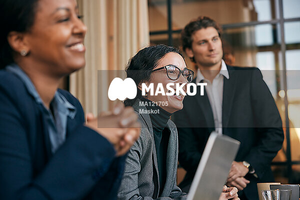 Glad affärskvinna sitter i möte med kollegor