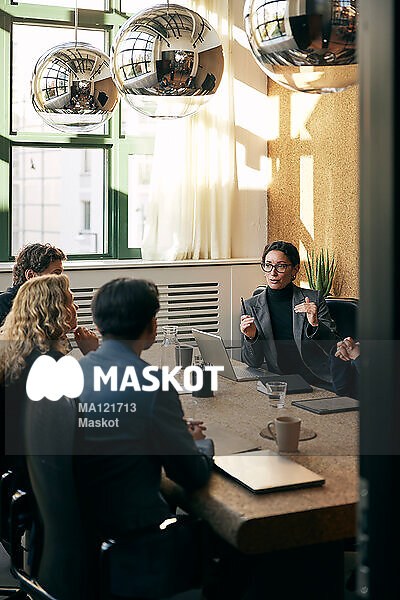 Affärskvinna förklarar för kollegor under möte