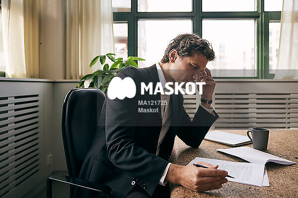 Affärsman läser på papper i konferensrum