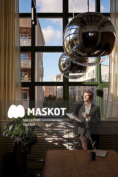Ung affärsman kollar ut genom fönster från konferensrum