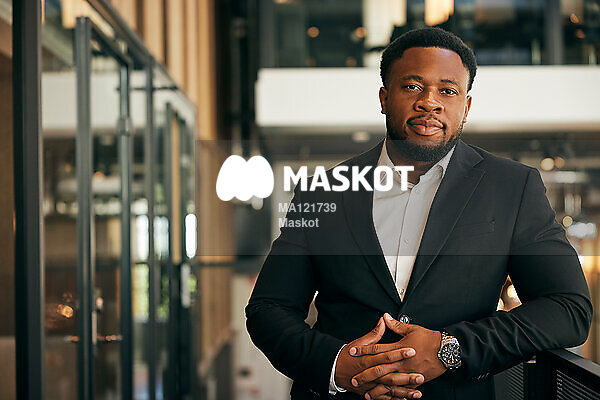 Portätt av affärsman som står vid räcke
