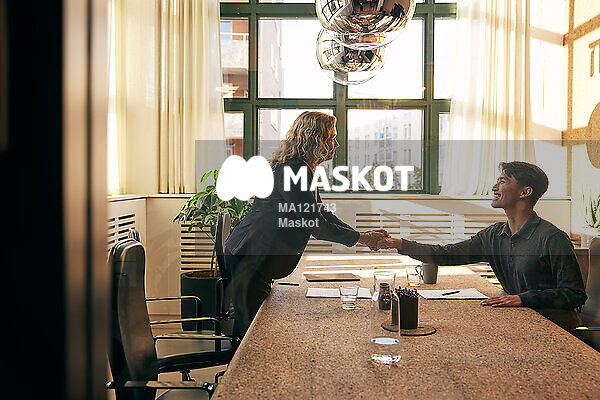 Affärskvinna skakar hand med manlig klient