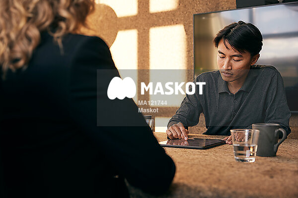 Ung man läser på surfplatta i konferensrum