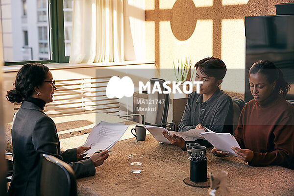 Affärskvinna går igenom kontrakt med ung man och kvinna