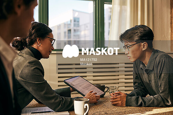 Kvinnlig rådgivare går igenom kontrakt med manlig klient
