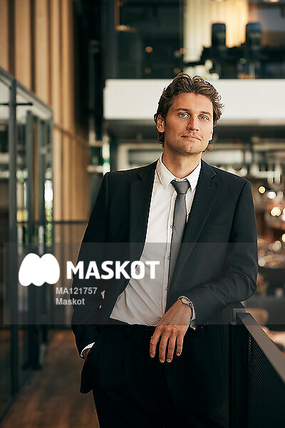 Porträtt av ung affärsman som står vid räcke