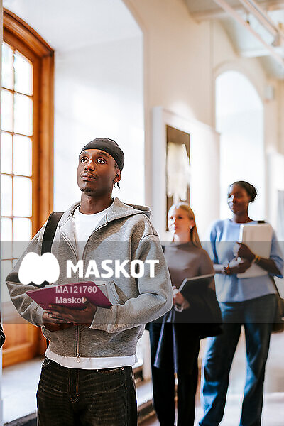 Ung man står i kö till föreläsning på universitet