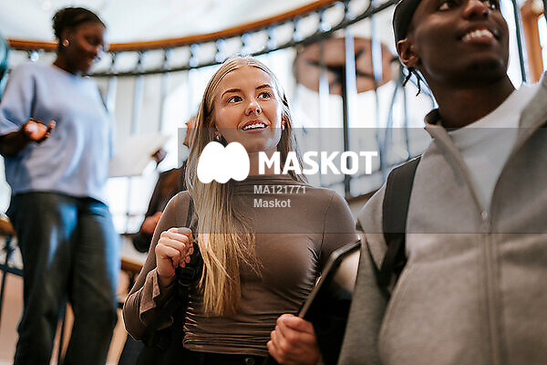 Glad kvinnlig student går i trappa på universitet
