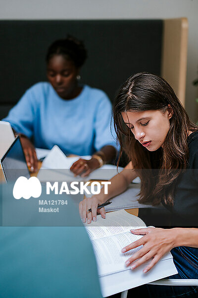 Ung kvinnlig student läser i bok på universitet